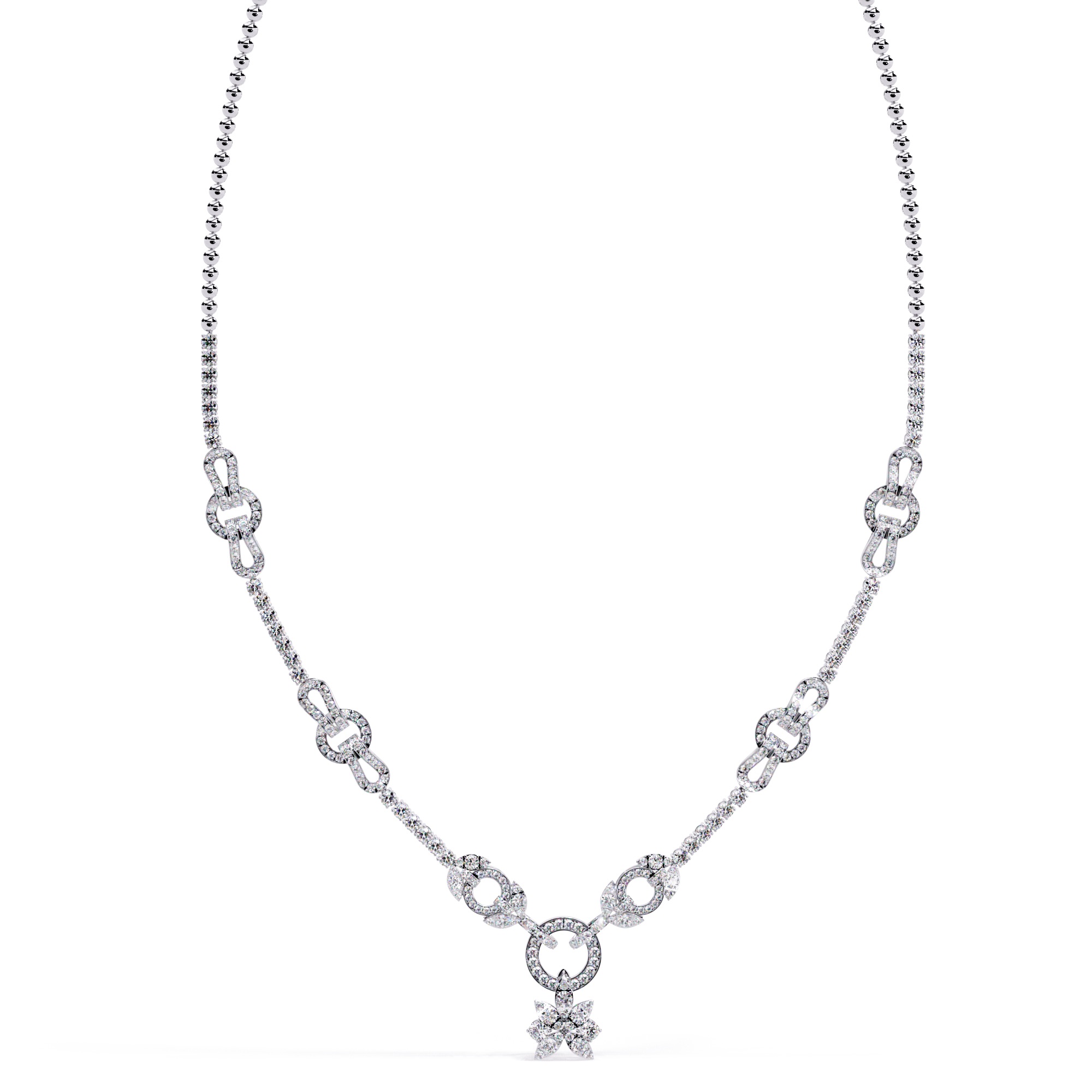 Delicate diamond bars connect each loop, forming a fluid rhythm that leads to a star-like diamond bloom at the center — the perfect finishing sparkle for the new-age wearer.