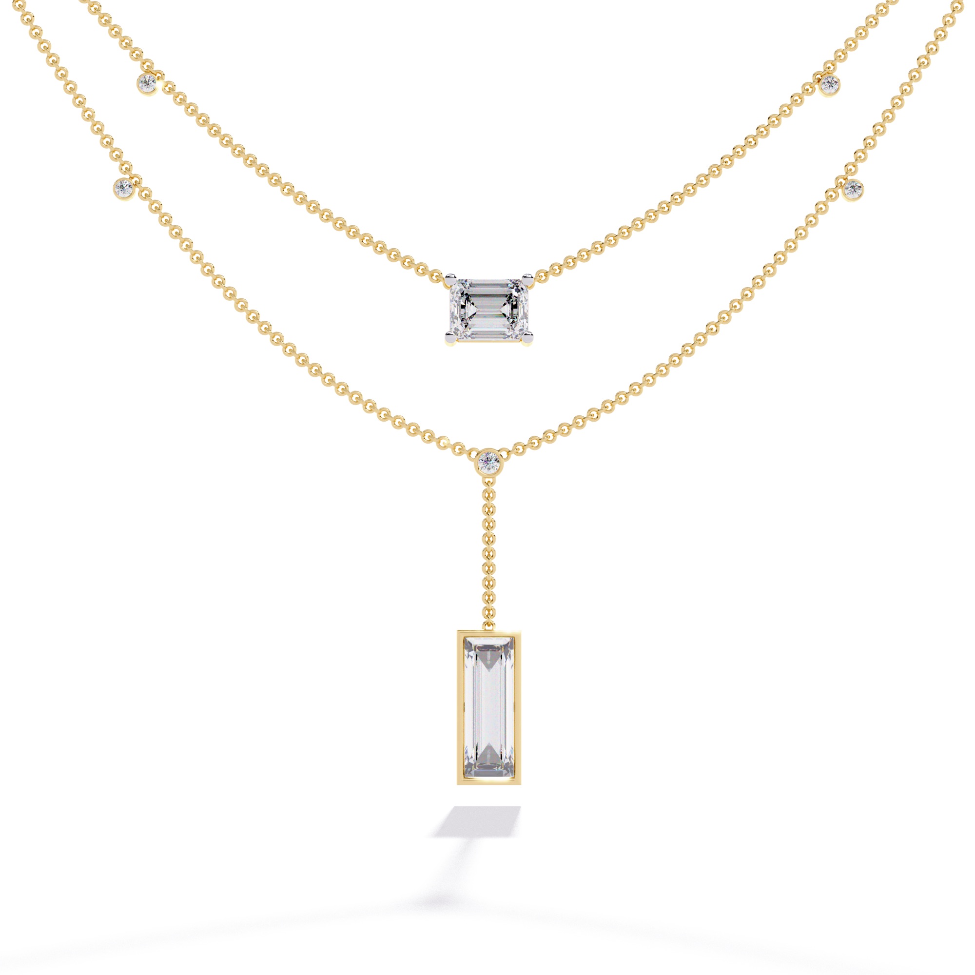 The HARMÉ LumeAxis Necklace is a study in symmetry, geometry, and luminous precision. A radiant emerald-cut centerpiece rests at the collarbone, framed with delicate bead-work links. From it, a slender drop descends, culminating in a long emerald-cut solitaire — a sleek column of clarity that elongates the neckline with effortless elegance.