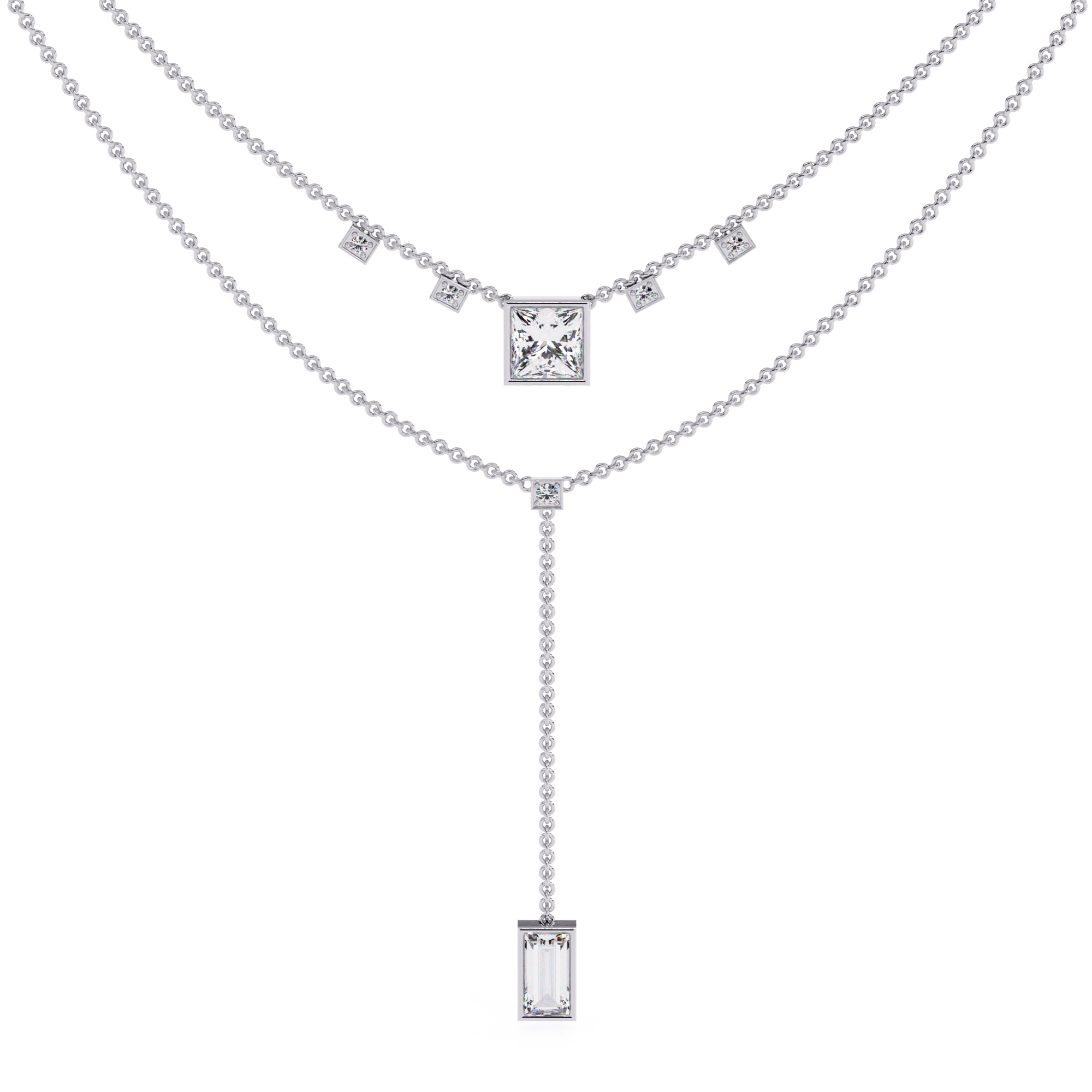 The HARMÉ PrismLuxe Necklace is a masterpiece of contemporary refinement. Its upper layer features a radiant square-cut centerpiece framed by floating accents, while the lower chain forms a graceful Y-drop ending in an elongated emerald-cut solitaire. Each stone glows with the clarity of VVS labgrown diamonds, merging conscious craftsmanship with timeless shine.