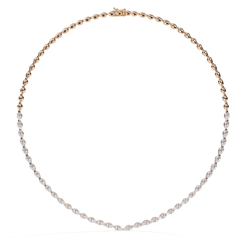 A graceful cascade of light, the Pear Rivulet Necklace features a continuous stream of exquisite Pear-cut lab-grown diamonds. Each diamond, selected for its VVS clarity and E-F color, is meticulously set to create a fluid, shimmering line that beautifully traces the curve of the neckline.